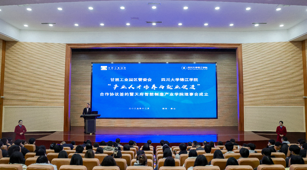 签约仪式上,四川大学锦江学院副校长冯建与甘眉工业园区党工委专职副书记杨青松代表双方签署“产业人才培养与就业促进”协议。双方将围绕人才培养、实习就业、技术研发等领域展开深度合作,构建优势互补、资源共享、协同发展的长效机制。