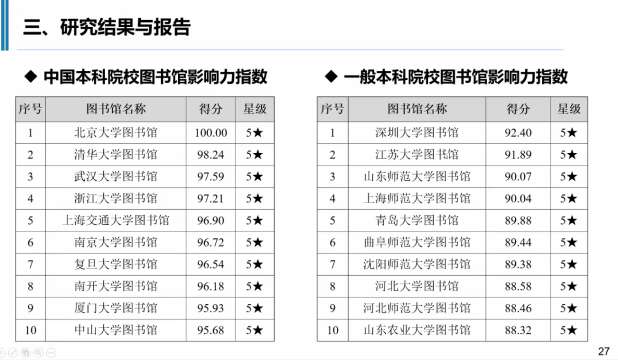 该报告覆盖普通高校图书馆2919家,包括1365所本科院校图书馆和1554所高职(专科)院校图书馆,公共图书馆1980家,各类型专业图书馆390家。在本科院校图书馆影响力指数排行榜中,北京大学、清华大学、武汉大学图书馆位列前三名;在一般本科院校图书馆影响力指数排行榜中,深圳大学、江苏大学、山东师范大学图书馆位列前三名。报告还对民办本科院校和高职高专院校图书馆进行了评价。